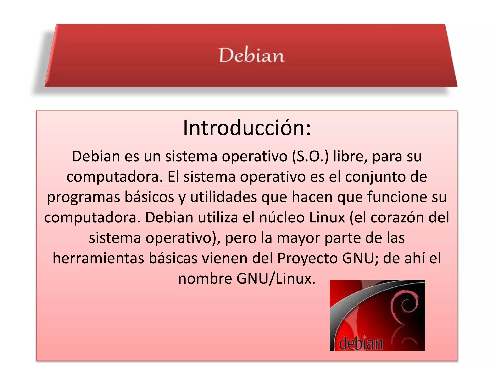 Debian es un sistema operativo libre basado en Linux y software de GNU. Utiliza programas libres empaquetados en formato .deb. El proyecto Debian es mantenido por desarrolladores y usuarios voluntarios y tiene como objetivo proporcionar software libre sin fines de lucro. Incluye características como SELinux, Firefox 3.0, Thunderbird 2.0, soporte para Live CD, Java a través de IcedTea y OpenJDK 6, y soporte para particiones NTFS y máquinas virtuales.