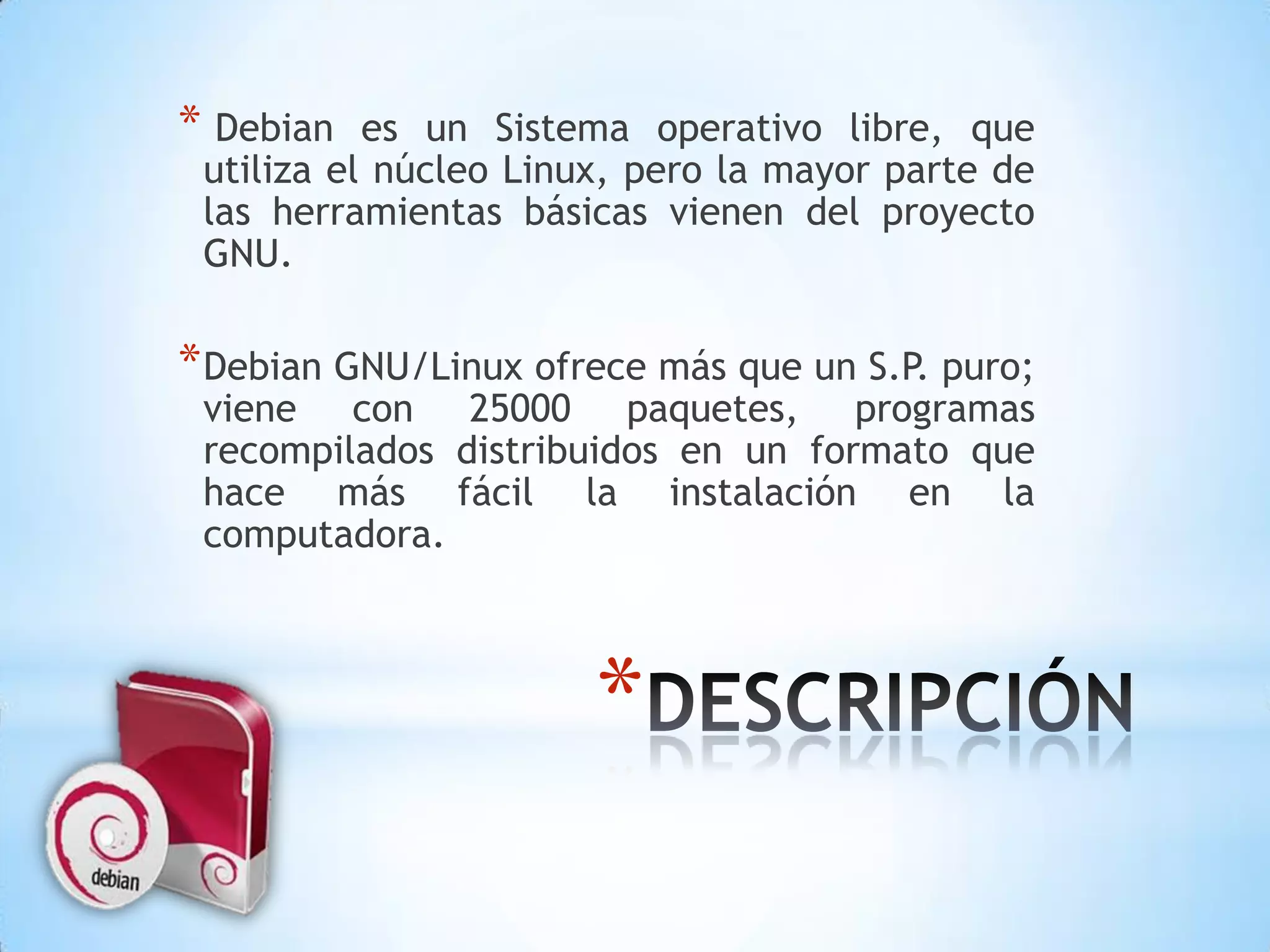 Debian es un sistema operativo libre basado en Linux que incluye más de 25,000 paquetes de software. Fue fundado en 1993 por Ian Murdock y desarrollado por voluntarios de todo el mundo. Ofrece soporte para varias arquitecturas, una amplia colección de software, y un compromiso con los principios del software libre.
