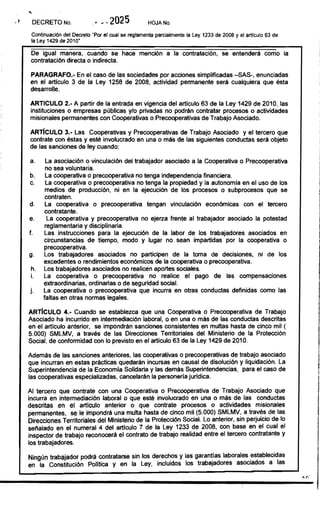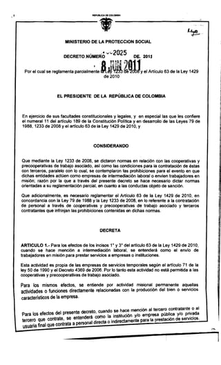 Este decreto reglamenta parcialmente la Ley 1233 de 2008 y el Artículo 63 de la Ley 1429 de 2010 en Colombia. Establece que las cooperativas no pueden realizar actividades de intermediación laboral ni contratar procesos permanentes con terceros. También describe conductas prohibidas como la falta de independencia financiera o autonomía en los procesos productivos. Finalmente, establece sanciones como multas de hasta 5.000 salarios mínimos para cooperativas, terceros contratantes y servidores públicos que infrinjan estas normas.