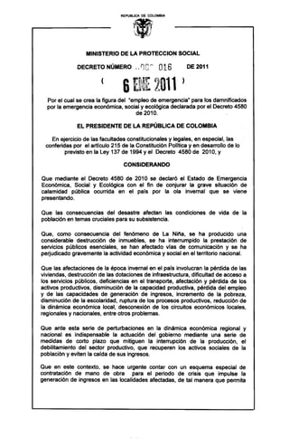 El decreto número 016 de 2011 establece la figura del 'empleo de emergencia' para auxiliar a los damnificados de la emergencia económica, social y ecológica en Colombia, provocada por la ola invernal. Este esquema temporal busca generar ingresos, mitigar las pérdidas económicas y prevenir el agravamiento de la pobreza en las comunidades afectadas. El empleo de emergencia se centra en actividades de rehabilitación e infraestructura, priorizando a los más necesitados y con una vigencia de un año.