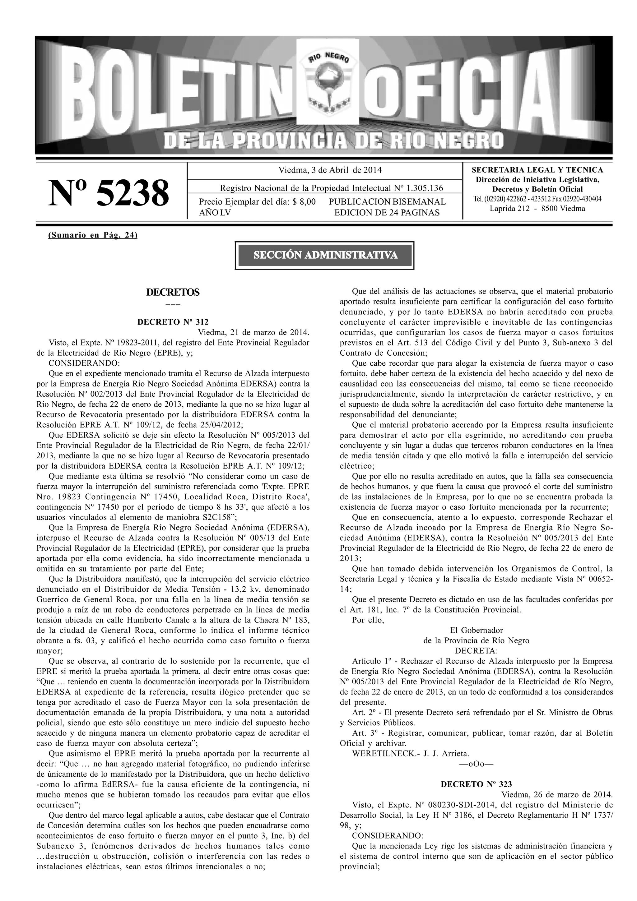 El decreto no 312, fechado el 21 de marzo de 2014, rechaza el recurso de alzada interpuesto por la empresa de energía Edersa contra una resolución del ente regulador que consideró insuficientes las pruebas presentadas para acreditar un caso de fuerza mayor en la interrupción del suministro eléctrico. Se concluye que Edersa no logró demostrar, de manera concluyente, que los hechos denunciados constituyeron un caso fortuito que justifique la interrupción del servicio. Además, se establece que la responsabilidad por la falta de evidencia recae sobre la denunciante, en este caso Edersa.