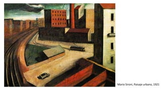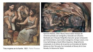 El documento presenta información sobre varias obras de arte, incluyendo pinturas de Pablo Picasso, Mario Sironi, Antonio Ruiz, María Izquierdo y Raquel Forner. Se describen las técnicas y temas de obras como "Tres mujeres en la fuente" de Picasso, "Paisaje urbano" de Sironi, y varias pinturas de Forner como "Ícaro", "Amanecer", "El juicio" y "El drama" que representan temas mitológicos y alegorías sobre la humanidad y la guerra.