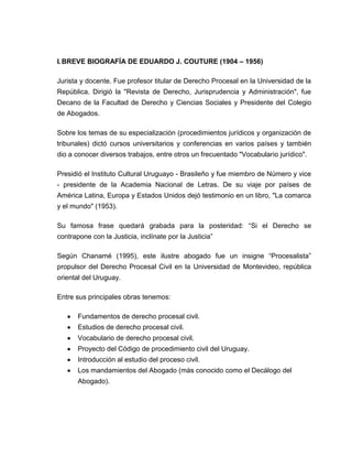 Este documento presenta el Decálogo del Abogado escrito por el jurista uruguayo Eduardo J. Couture. El decálogo contiene 11 mandamientos que guían la conducta ética de los abogados. Incluye mandamientos como estudiar continuamente para estar al día con los cambios legales, pensar con lógica e intuición, trabajar con dedicación en todos los casos, luchar con lealtad, y amar su profesión. El decálogo busca establecer los más altos ideales en el ejercicio de la abogacía.