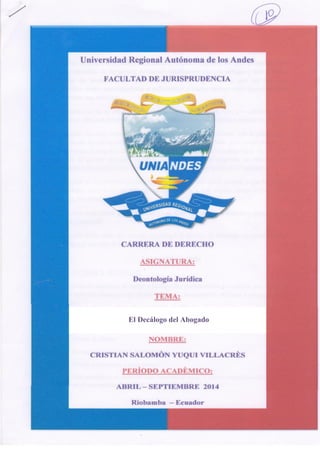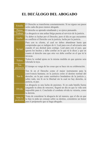 Este documento presenta el "Decálogo del Abogado", una guía de 10 principios para el ejercicio ético de la abogacía. Los principios incluyen estudiar constantemente para mantenerse actualizado, pensar críticamente, trabajar arduamente en pos de la justicia, luchar por el derecho pero priorizando la justicia, ser leal con el cliente, adversario y juez, tolerar otras perspectivas, tener paciencia, fe en el derecho, la justicia y la libertad, olvidar rencores pasados, y amar la profesión.