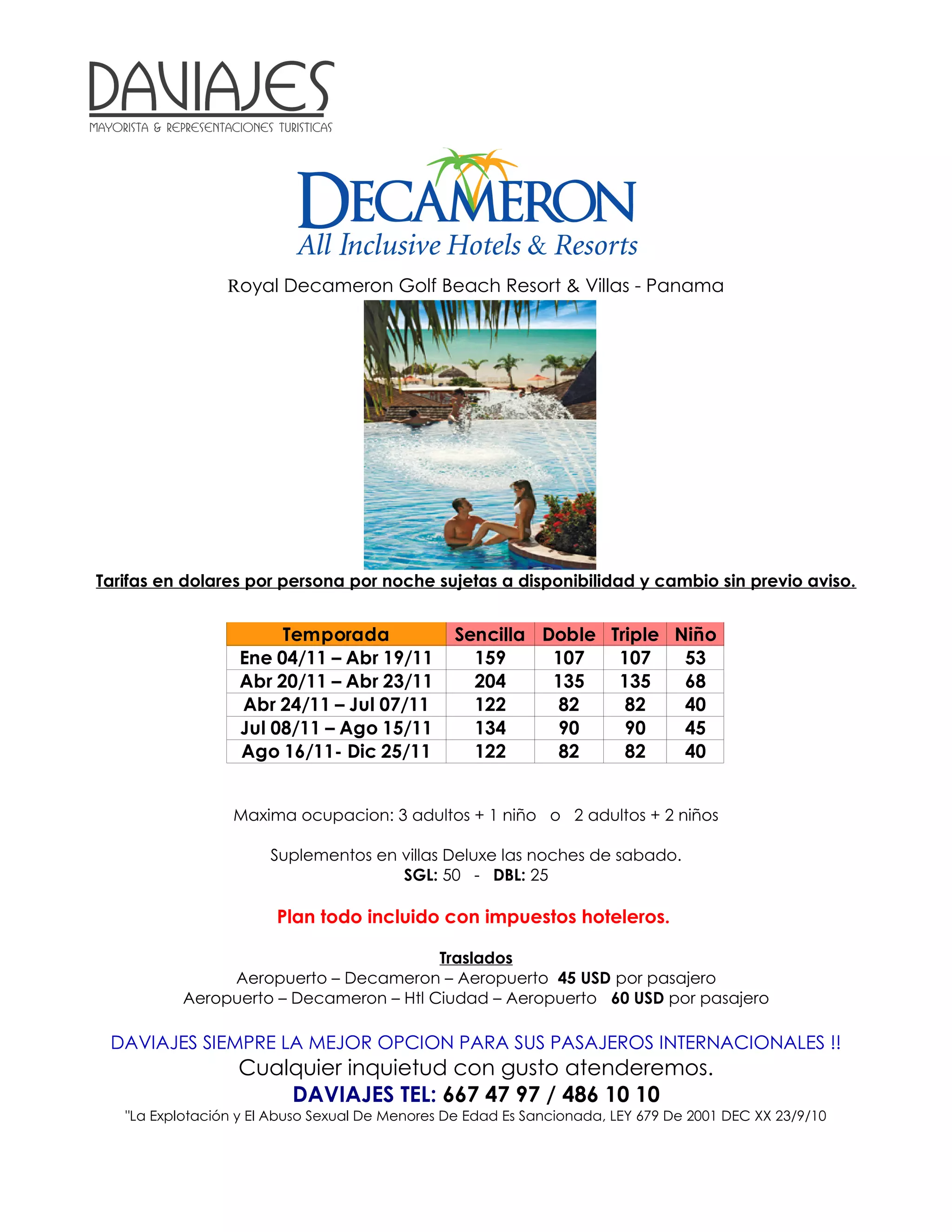 El documento presenta las tarifas por noche en dólares estadounidenses para el Royal Decameron Golf Beach Resort & Villas en Panamá según la temporada. Las tarifas varían de $59 a $204 por persona para habitaciones individuales y dobles y de $107 a $135 para habitaciones triples. También incluye suplementos para villas de lujo los sábados y detalles sobre el plan todo incluido, traslados desde y hacia el aeropuerto, y los contactos de la agencia de viajes Daviajes.