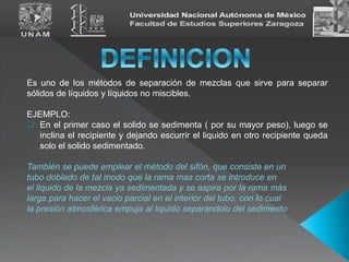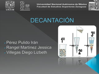 La decantación es un método de separación de mezclas que utiliza la diferencia de densidad entre componentes para separar sólidos de líquidos o líquidos no miscibles. Se basa en dejar reposar la mezcla para que los componentes más densos se asienten en la parte inferior por acción de la gravedad, permitiendo luego vaciar el componente superior. Tiene aplicaciones tanto en el laboratorio como en la industria, por ejemplo en la elaboración de aceite y el tratamiento de aguas residuales.