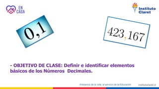 2. El objetivo es definir e identificar elementos básicos de los números decimales como su representación, partes enteras y decimales, y equivalencias con fracciones.