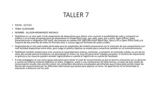SlideShare es un sitio web que permite a los usuarios subir y compartir presentaciones en formatos como PowerPoint, PDF y Word. Originalmente estaba destinado a empleados para compartir diapositivas, pero ahora también se usa para entretenimiento. Los usuarios pueden evaluar, comentar y compartir contenido de forma gratuita. A nivel educativo, SlideShare se usa como apoyo didáctico ya que permite que estudiantes e instructores interactúen y accedan a material actualizado de manera más sencilla.