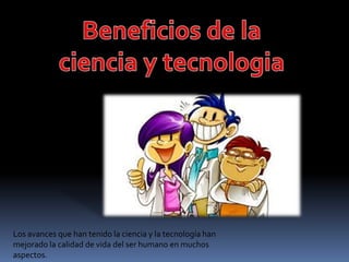 La ciencia y la tecnología han mejorado la calidad de vida humana al contribuir al desarrollo intelectual y generar beneficios para la salud y calidad de vida. Los avances científicos han permitido entender y prevenir enfermedades, desarrollar tecnologías agrícolas para aumentar la producción de alimentos, e inventos como la máquina de vapor que revolucionaron la industria y el transporte. La ciencia y tecnología modernas ahora permiten la comunicación global instantánea a través de internet y satélites.