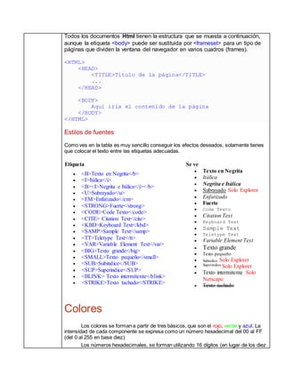 Este documento presenta una guía de trabajo para el aprendizaje del lenguaje HTML para el diseño de páginas web. Incluye información sobre la estructura básica de HTML, etiquetas para formato de texto, tablas de colores, y tres actividades relacionadas con la creación de tablas y diseño de páginas web sobre COVID-19.