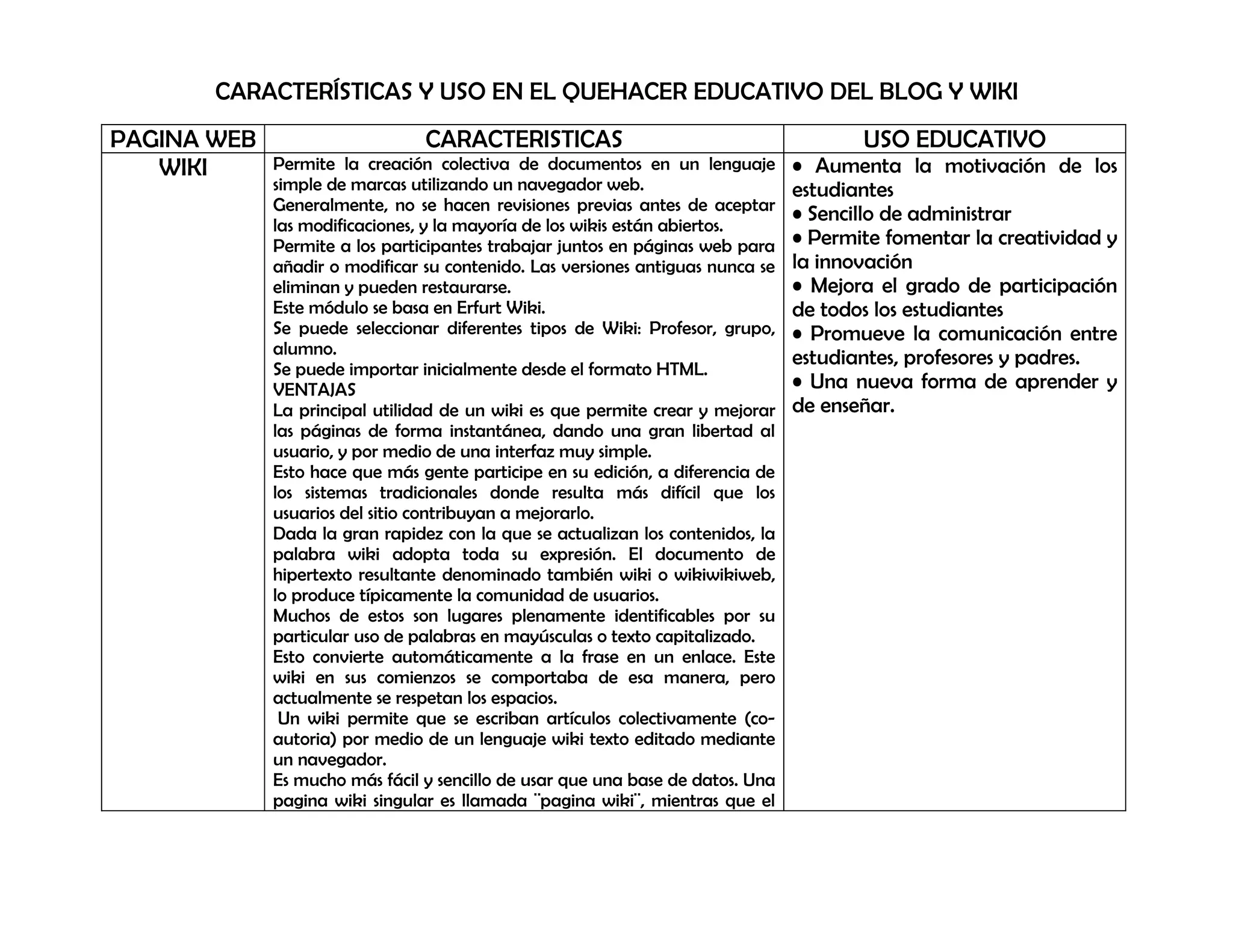El documento resume las características y usos educativos del blog y wiki. Un wiki permite la creación colaborativa de documentos de forma sencilla y sin revisiones previas, lo que fomenta la participación. Un blog permite publicar contenido de forma individual en orden cronológico y clasificado por temas. Ambos pueden usarse para mejorar la motivación, creatividad y comunicación entre estudiantes y profesores.