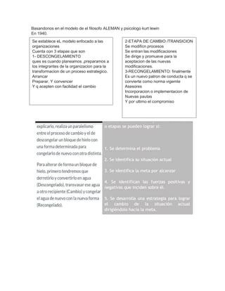 El modelo de cambio organizacional propuesto por Kurt Lewin se compone de tres etapas: 1) descongelamiento, en la que se prepara a la organización para el cambio, 2) transición, donde se modifican procesos y se promueve la aceptación de los nuevos, y 3) recongelamiento, cuando el nuevo patrón de conducta se convierte en la norma.