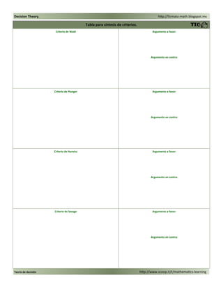 El documento habla sobre la teoría de decisión. Explica que se deben presentar las tablas iniciales de datos y resultados para la aplicación de criterios de decisión como Wald, Plunger, Hurwicz, Savage y Laplace. También menciona crear un diagrama de árbol para visualizar las posibles decisiones.