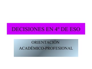 Este documento ofrece orientación sobre las opciones académicas y profesionales disponibles para estudiantes de 4o de ESO, incluyendo titular en ESO, bachillerato, ciclos formativos de grado medio, y perfiles profesionales. Resume los requisitos para acceder a cada opción y las materias involucradas.