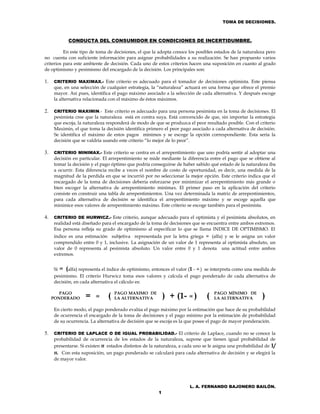 Este documento describe 5 criterios para la toma de decisiones bajo condiciones de incertidumbre cuando no se conocen las probabilidades de los posibles resultados. El criterio Maximax es adecuado para personas optimistas, mientras que el criterio Maximin es para personas pesimistas. El criterio Minimax se centra en minimizar el mayor arrepentimiento. El criterio de Hurwicz es para personas entre optimistas y pesimistas. El criterio de Laplace asume igual probabilidad para todos los resultados posibles.