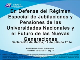 La declaración de Mérida, firmada por la FAPUV y Fondunive, defiende el régimen especial de jubilaciones y pensiones de las universidades nacionales en Venezuela, ante auditorías que cuestionan su validez. Se destaca la inaplicabilidad de la Ley Orgánica del Sistema de Seguridad Social (LOSS) para el personal universitario, dado que el régimen existente es legal y garantiza derechos adquiridos. La FAPUV y Fondunive rechazan cualquier intento de cambio que perjudique a las futuras generaciones de profesores universitarios y afirman la vigencia y obligatoriedad de su sistema propio de pensiones.
