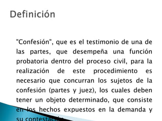 "Confesión", que esel testimonio de una de las partes, que desempeña una función probatoria dentro del proceso civil, para la realización de este procedimiento es necesario que concurran los sujetos de la confesión (partes y juez), los cuales deben tener un objeto determinado, que consiste en los hechos expuestos en la demanda y su contestación.