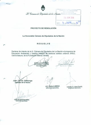 El documento propone declarar de interés de la Cámara de Diputados el programa "Usá la basura" de la Fundación Manos Verdes, cuyo objetivo es concientizar sobre la reducción, reutilización y reciclaje de residuos sólidos urbanos. El programa se implementa desde 2009 en colegios de Argentina para promover la educación ambiental y gestión sustentable de residuos. Busca que los estudiantes entiendan que los residuos tienen valor como recursos.