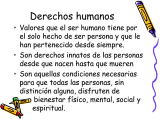 Este documento presenta la Declaración Universal de Derechos Humanos de 1948. Describe los derechos humanos fundamentales como derechos inherentes a todos los seres humanos, sin distinción. Estos incluyen el derecho a la vida, la libertad, la igualdad, la seguridad personal, la privacidad y la propiedad. También prohíbe la esclavitud, la tortura y la discriminación, y garantiza derechos como la presunción de inocencia, la libertad de circulación y el derecho a buscar asilo.