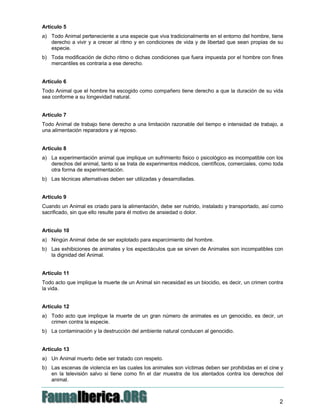 La Declaración Universal de los Derechos de los Animales reconoce que todos los animales tienen derechos a la vida y al respeto. Proclama que ningún animal debe ser sometido a malos tratos o experimentación que cause sufrimiento, y que los animales salvajes tienen derecho a vivir libres en su hábitat natural. También establece que los animales domésticos y de trabajo tienen derecho a condiciones de vida y trato que sean apropiados para su especie.