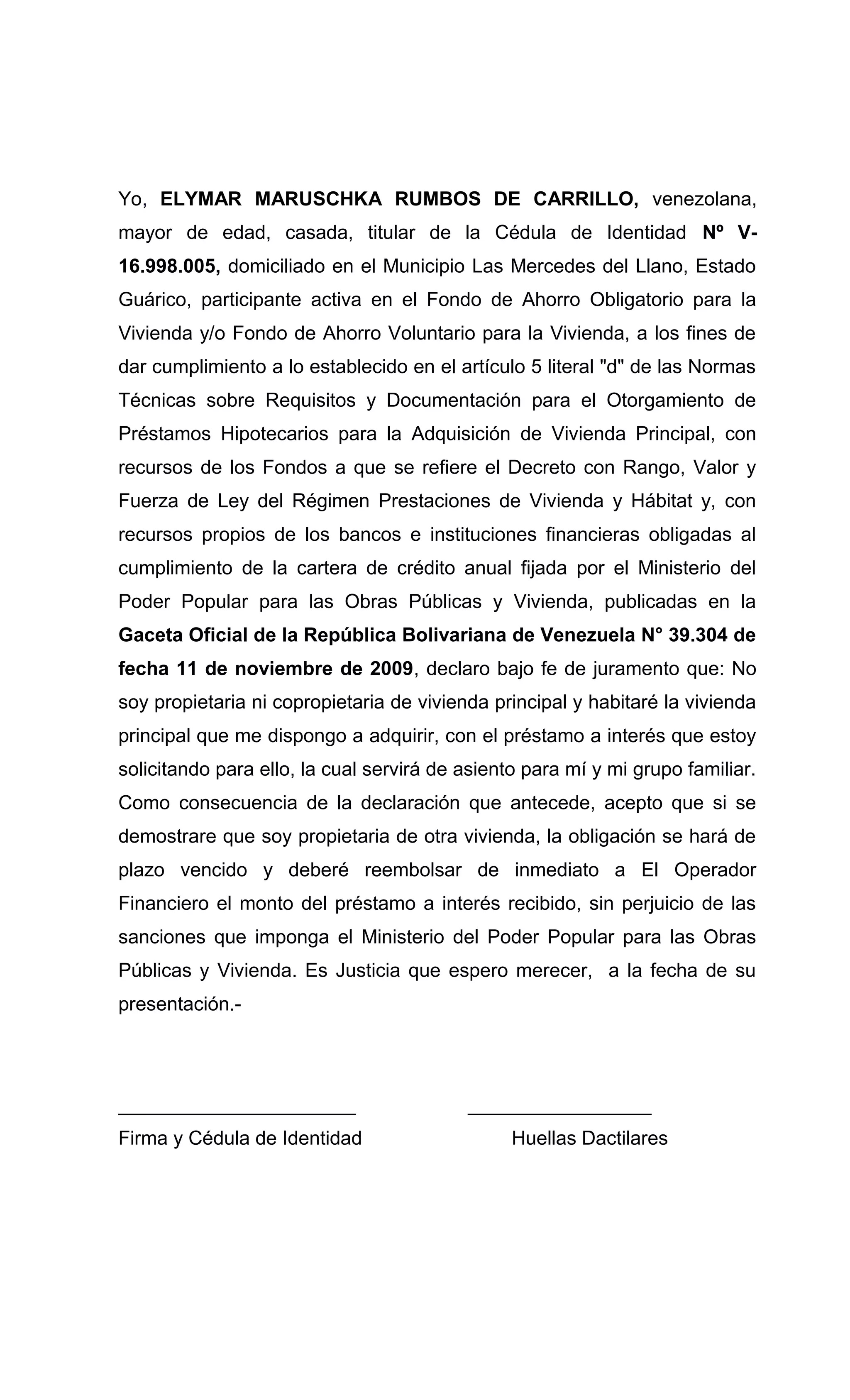 La persona declara bajo juramento que no es propietaria ni copropietaria de una vivienda principal y que habitará la vivienda que planea adquirir con el préstamo hipotecario solicitado. Acepta que deberá reembolsar de inmediato el préstamo si se demuestra que es propietaria de otra vivienda.