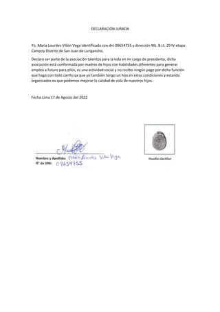 Maria Lourdes Villón Vega declara ser la presidenta de la asociación Talentos para la Vida, la cual está conformada por madres de hijos con habilidades diferentes y tiene como objetivo generar empleo para ellos en el futuro. Ella realiza este trabajo de forma voluntaria y sin recibir pago alguno, motivada por el cuidado de su propio hijo que se encuentra en similares condiciones.