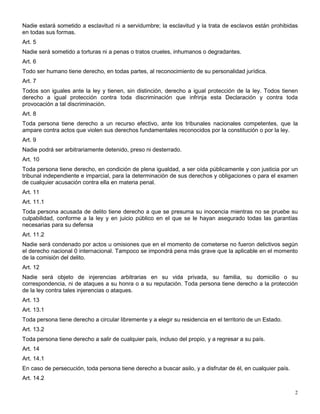 La Declaración Universal de Derechos Humanos establece los derechos y libertades fundamentales de todas las personas. Reconoce que todos los seres humanos nacen libres e iguales y tienen derecho a la vida, la libertad y la seguridad. Enumera una serie de derechos civiles, políticos, económicos, sociales y culturales como la libertad de opinión, el derecho a un juicio justo y la protección contra la discriminación. Tiene como objetivo promover la dignidad y el valor de cada persona en todo el mundo.