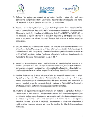La Declaración Ministerial de la CELAC sobre Agricultura Familiar y Desarrollo Rural acuerda: 1) fortalecer la coordinación para implementar el Plan de Acción 2018 con apoyo de la Presidencia Pro-Témpore, 2) reafirmar el compromiso con el Grupo de Trabajo Ad-hoc de Agricultura Familiar de la CELAC y los espacios subregionales, solicitando apoyo a organismos como FAO, ALADI y CEPAL para identificar los 100 territorios con mayor hambre, y 3) adoptar el Plan de Acción 2018 del