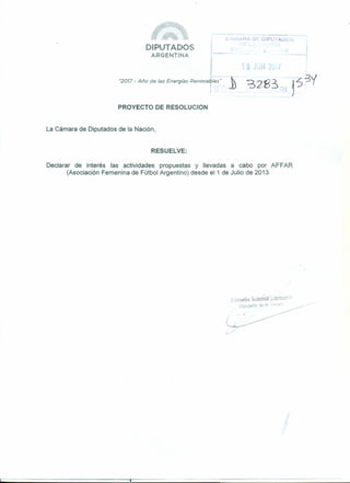 La Asociación Femenina de Fútbol Argentino (AFFAR) promueve el desarrollo del fútbol femenino en Argentina a través de torneos, entrenamientos, talleres y asistencia social. El documento propone declarar de interés las actividades de AFFAR para apoyar el crecimiento del deporte femenino y brindar contención a las jugadoras.