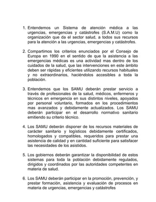 Este documento establece las bases para el desarrollo de sistemas de atención médica de urgencias, emergencias y catástrofes. Define un sistema de atención médica de urgencias como una organización que coordina los recursos del sector salud para atender urgencias. Establece que estos sistemas deben prestar servicios las 24 horas a toda la población a través de profesionales médicos, de enfermería y técnicos capacitados. También requiere que los gobiernos garanticen la disponibilidad y regulación de