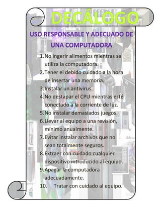 Este documento proporciona 10 consejos de seguridad y cuidado para el uso de una computadora, incluyendo no comer cerca de la computadora, tener cuidado al insertar memorias, instalar un antivirus, no abrir la CPU mientras está conectada, llevar la computadora a revisión anualmente y apagarla adecuadamente.