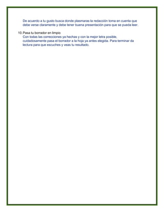 Este documento presenta un decálogo para la redacción de documentos. El decálogo incluye 10 pasos: 1) analizar el título y tema, 2) buscar información relevante, 3) hacer un borrador con las ideas principales, 4) revisar la ortografía, 5) usar sinónimos, 6) estructurar en párrafos, 7) leer en voz alta, 8) pedir a alguien más que revise, 9) seleccionar el papel o libreta, y 10) pasar el borrador en limpio con las correcciones.