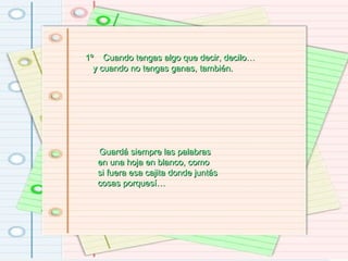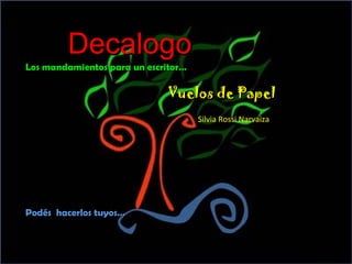 Este documento presenta 10 mandamientos o consejos para un escritor. Algunos de los consejos principales son: escribir tanto cuando tienes algo que decir como cuando no, ejercitar la escritura leyendo y reescribiendo constantemente, expresar tus propias emociones sin preocuparte por los demás lectores, y recordar que como autor eres dueño de tus propias palabras y emociones. El objetivo general es alentar al escritor a expresarse libremente y volar a través de sus palabras.