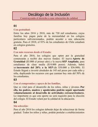 El documento presenta un decálogo de 10 puntos sobre la inclusión en la educación en Chile. Entre los puntos principales se encuentran: 1) La gratuidad de la educación para el 93% de los estudiantes para el 2018; 2) Un aumento de los recursos estatales para los colegios que opten por la gratuidad, llegando a invertir $145,000 por estudiante; 3) La eliminación gradual de la selección de estudiantes en los colegios subvencionados para el 2016.