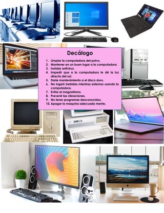Este documento proporciona 10 recomendaciones para el cuidado y mantenimiento de una computadora, incluyendo limpiar el polvo, mantenerla en un lugar apropiado, instalar antivirus, protegerla de la luz solar directa, dar mantenimiento al disco duro, evitar bebidas e ingerir alimentos, alejarla de imanes, prevenir vibraciones, no instalar programas desconocidos y apagarla correctamente.