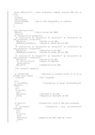 Este resumen describe un decodificador DTMF que utiliza un PIC16F628A para decodificar dígitos DTMF ingresados desde un teléfono. Detecta secuencias de 4 dígitos para activar o desactivar pines de salida, o para activar un pin durante 10 segundos. También enciende un pin cada 12 horas durante 1 hora. El código en C implementa estas funciones de decodificación y temporización.