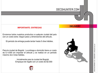 El documento presenta un catálogo de productos para el hogar con información sobre sus características, materiales, dimensiones y precios. Incluye artículos como lámparas, relojes, candelabros, utensilios de cocina y más. Explica también los detalles de entrega a Bogotá y otras ciudades del país.