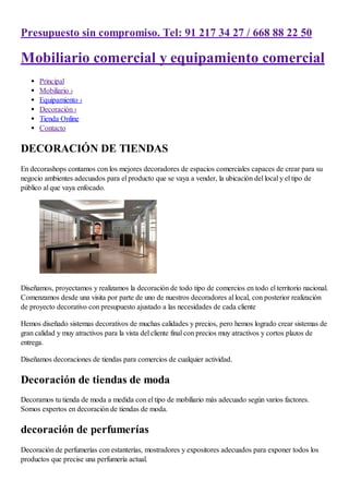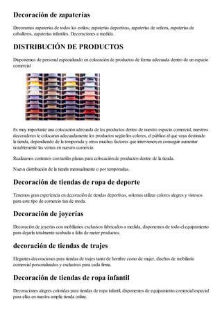 Este documento describe los servicios de decoración de tiendas que ofrece Decorashops, incluyendo diseño y decoración de tiendas de moda, perfumerías, zapaterías, ropa deportiva, joyerías, trajes e infantil. Decorashops cuenta con decoradores expertos que crean ambientes adecuados según el producto, ubicación y público, y ofrece soluciones de decoración moderna, clásica o temática.