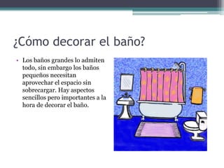 Este documento ofrece consejos para decorar baños teniendo en cuenta el tamaño, la iluminación y el uso del espacio. Recomienda usar colores claros y luminosos en baños pequeños con poca luz e instalar muebles grandes y espejos amplios en baños espaciosos. También sugiere cambiar grifos y accesorios por opciones más funcionales y decorativas.