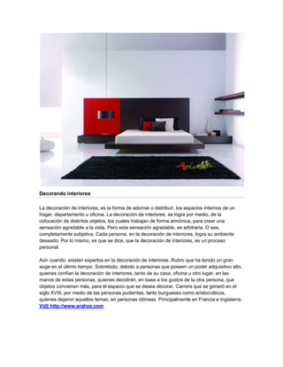 La decoración de interiores es el proceso de adornar y distribuir los espacios internos de un hogar u oficina colocando objetos de forma armoniosa para crear una sensación agradable a la vista. Aunque esta sensación es subjetiva y cada persona logra su ambiente deseado, existen expertos en decoración de interiores cuya carrera surgió en el siglo XVIII cuando personas pudientes confiaban la decoración de sus espacios a estas personas idóneas, principalmente en Francia e Inglaterra.