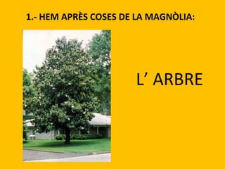 El documento habla sobre las cosas de la magnolia: el árbol, el fruto, la flor y la hoja. Luego dice que han decorado sus propias hojas.