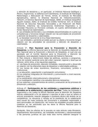 Este decreto establece el Sistema Nacional para la Prevención y Atención de Desastres en Colombia. Define los objetivos y componentes del sistema, incluyendo la creación de comités a nivel nacional, regional y local. También describe los planes y acciones requeridos para la prevención, atención y recuperación ante desastres, así como los roles de las diferentes entidades públicas y privadas en la implementación del sistema.