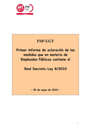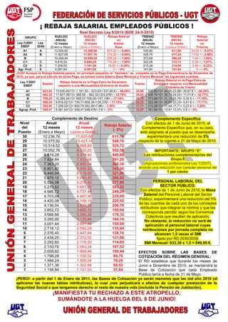 Este documento resume las medidas de reducción salarial contenidas en el Real Decreto-Ley 8/2010 para los empleados públicos en España. Establece rebajas salariales de entre el 0,24% y el 4,49% para los diferentes grupos de empleados públicos, así como rebajas en los trienios y complementos. También reduce los salarios de los empleados laborales del sector público en un 5% y las bases de cotización a partir de enero de 2011. El documento anima a los empleados públicos a sumarse a una huelga el 8 de jun