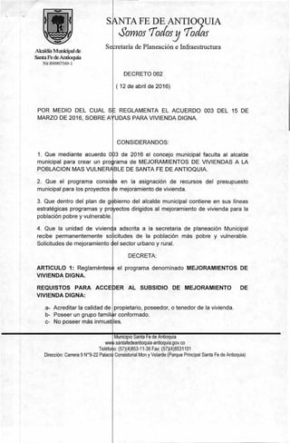 Este decreto reglamenta un programa municipal para mejorar las viviendas de la población más vulnerable de Santa Fe de Antioquía. El programa asigna recursos del presupuesto para proyectos de mejoramiento de vivienda dirigidos a familias pobres que cumplan ciertos requisitos como estar en el Sisbén y a paz y salvo con el impuesto predial. El decreto establece un comité de adjudicación, especifica los materiales y mano de obra que se usarán, y entrega subsidios en especie para mejorar viviendas deficientes en sect