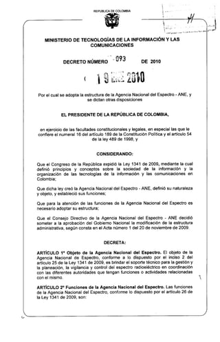 El decreto número 093 de 2010 establece la estructura y funciones de la Agencia Nacional del Espectro (ANE) en Colombia, creada por la ley 1341 de 2009, con el objetivo de gestionar y monitorear el espectro radioeléctrico. La ANE tiene atribuciones que incluyen asesorar al Ministerio de Tecnologías de la Información, imponer sanciones por infracciones al régimen del espectro, y coordinar con organismos internacionales. Su estructura comprende un consejo directivo, dirección general y varias subdirecciones encargadas de la gestión técnica, vigilancia y control del espectro.