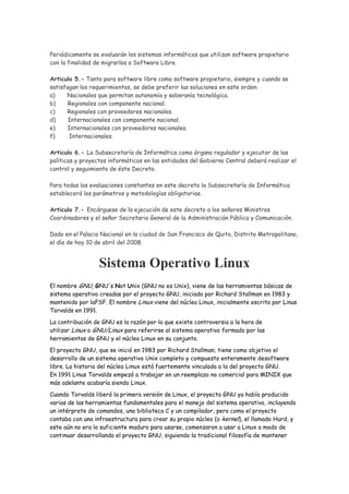 El decreto presidencial 1014 establece como política pública para las entidades de la administración pública central en Ecuador la utilización de software libre en sus sistemas informáticos. Se define software libre como programas de computación que pueden utilizarse y distribuirse sin restricciones y cuyos códigos fuentes están disponibles para su modificación y mejora. Las entidades públicas deberán verificar la existencia de soporte técnico para el software libre antes de su instalación.