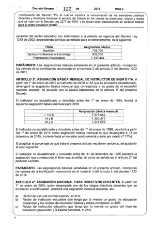 Este decreto modifica la remuneración de los docentes y directivos docentes del sector educativo estatal en Colombia. Establece nuevas asignaciones básicas mensuales para cada grado del escalafón docente, así como asignaciones adicionales para directivos, instructores, supervisores y docentes de preescolar. También reconoce pagos adicionales por gestión educativa, número de jornadas y trabajo en zonas rurales. El objetivo es mejorar las condiciones salariales del sector para el año 2016.