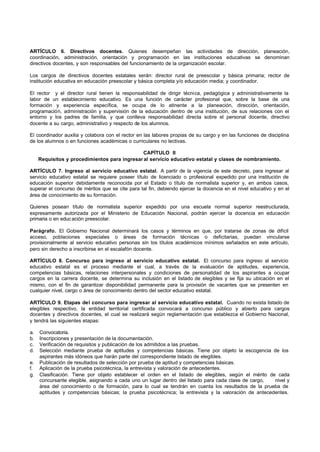 Este decreto establece el Estatuto de Profesionalización Docente en Colombia. Define los requisitos para ser docente, como tener un título de licenciatura o normalista superior. Establece que los docentes deben ingresar mediante un concurso de méritos y tener un periodo de prueba antes de ser inscritos de manera permanente. También crea un escalafón docente que reconoce el mérito y la antigüedad de los maestros.