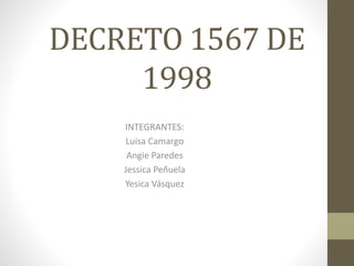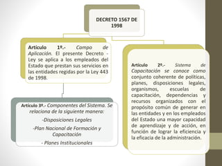 El decreto establece el Sistema de Capacitación para los empleados del Estado, el cual se compone de disposiciones legales, planes de formación y capacitación, recursos y organismos. Define la capacitación como procesos organizados para complementar la educación inicial de los empleados mediante el desarrollo de conocimientos y habilidades. Establece también programas de bienestar social e incentivos para elevar la satisfacción y desempeño de los empleados a través de condiciones laborales favorables y reconocimiento de resultados excelentes.