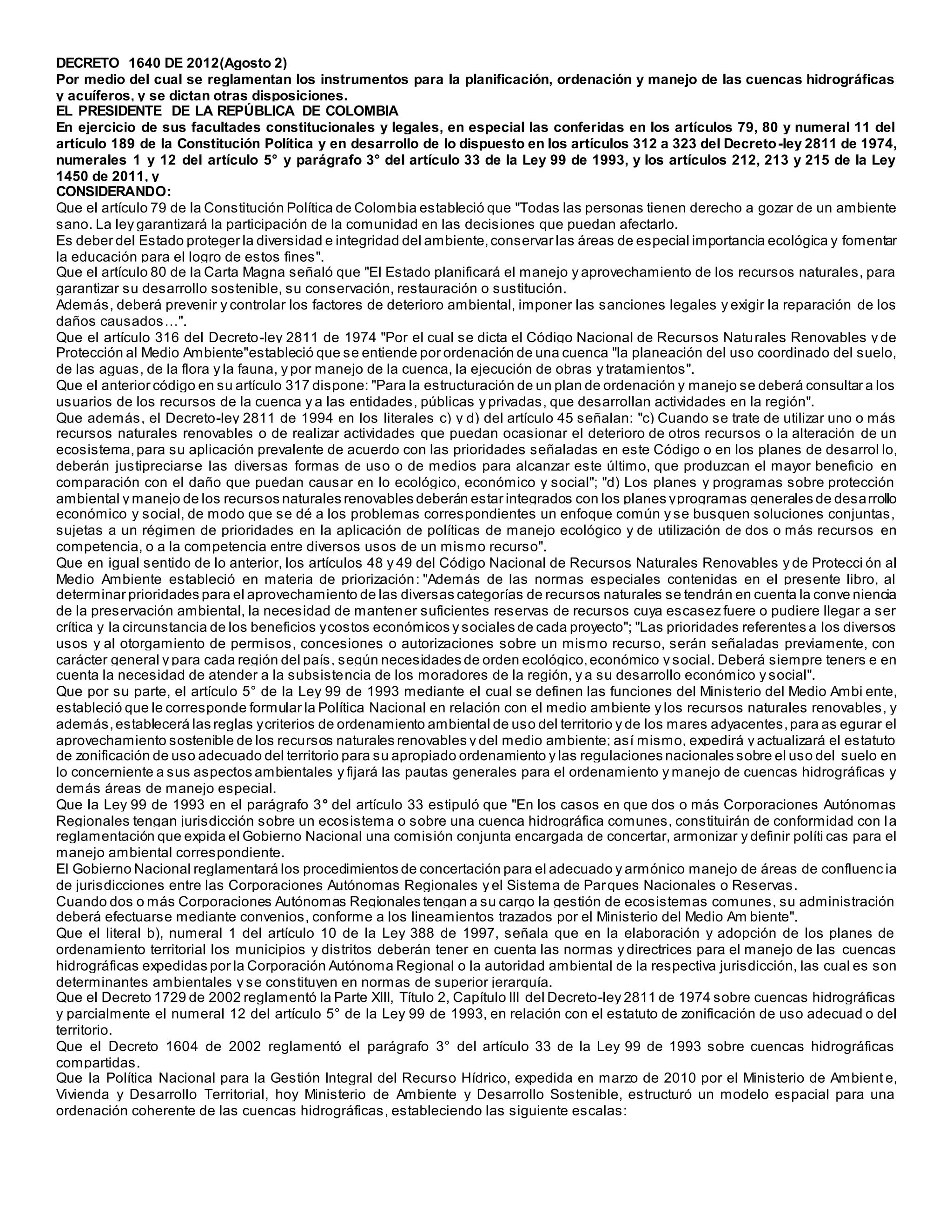 Este decreto establece los instrumentos para la planificación, ordenación y manejo de las cuencas hidrográficas y acuíferos en Colombia. Define cuatro escalas para la gestión de cuencas (macrocuencas, zonas hidrográficas, subcuencas y microcuencas) y requiere la formulación de planes de manejo en cada nivel. Además, reglamenta la constitución y funciones de las comisiones conjuntas de cuencas compartidas por varias autoridades ambientales.